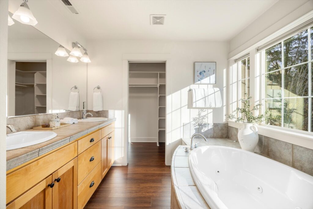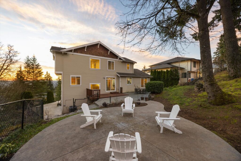 Upstairs, the primary suite serves as a calming escape, featuring a spacious en suite bath with a soaking tub, separate shower, dual vanities, and a walk-in closet. Outdoor living is equally impressive with a flat patio, deck, raised firepit area, and beautifully terraced yard designed for entertaining and enjoying Oregon sunsets.