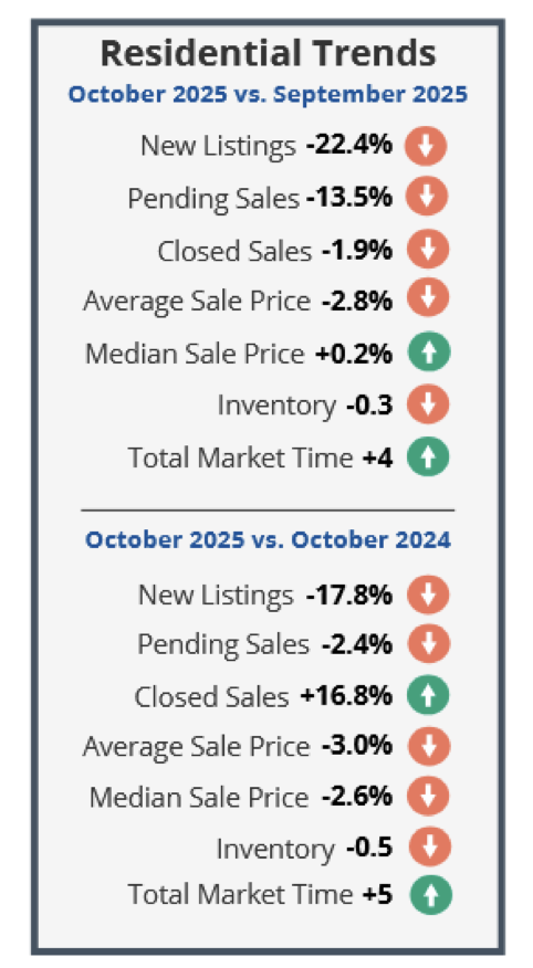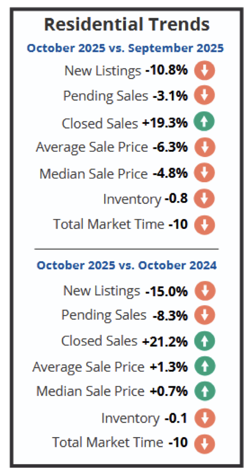 New listings (255) decreased 15.0% from the 300 listed in October 2024, and decreased 10.8% from the 286 listed in September 2025. Pending sales (220) decreased 8.3% from the 240 offers accepted in October 2024, and decreased 3.1% from the 227 offers accepted in September 2025. Closed sales (229) increased 21.2% from the 189 closings in October 2024, and increased 19.3% from the 192 closings in September 2025.