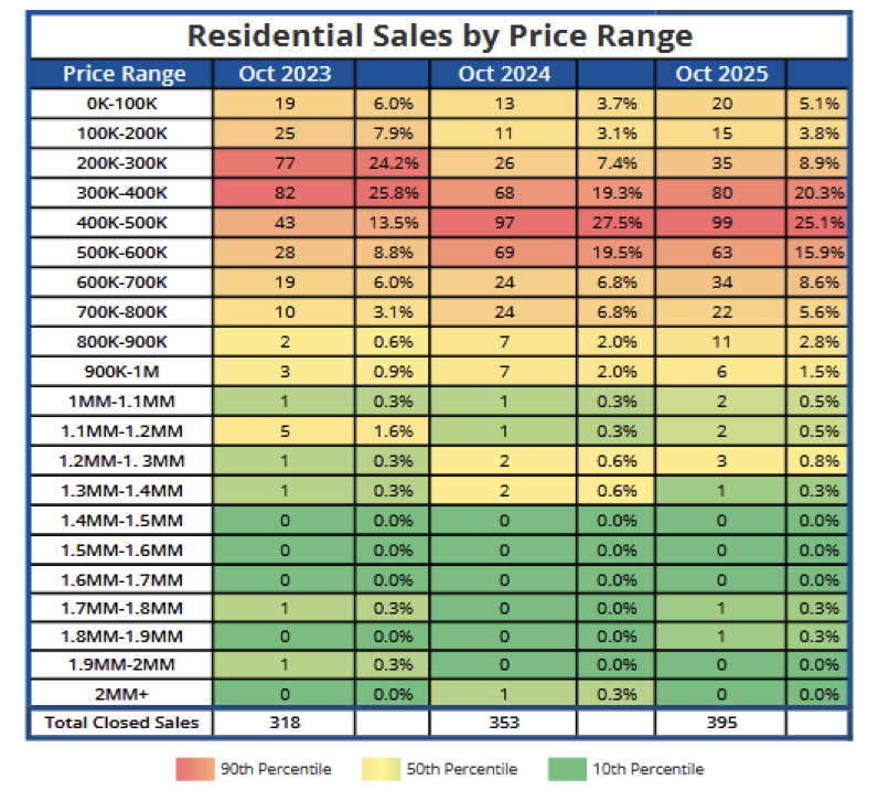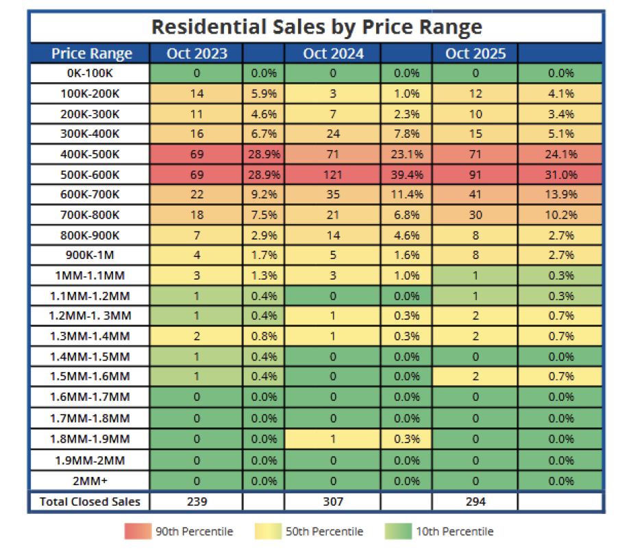 Comparing the first ten months of 2025 to the same period in 2024, new listings (4,526) increased 2.4%, pending sales (3,450) increased 3.9%, and closed sales (3,304) increased 5.9%.