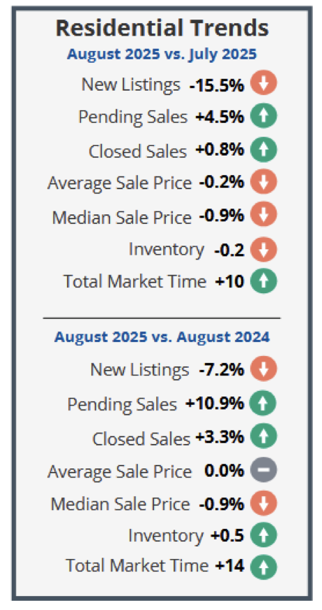New listings (789) increased 3.5% from the 762 listed in August 2024, and decreased 3.8% from the 820 listed in July 2025. Pending sales (595) increased 6.8% from the 557 offers accepted in August 2024, and decreased 6.9% from the 639 offers accepted in July 2025. Closed sales (554) decreased 0.2% from the 555 closings in August 2024, and decreased 5.1% from the 584 closings in July 2025.