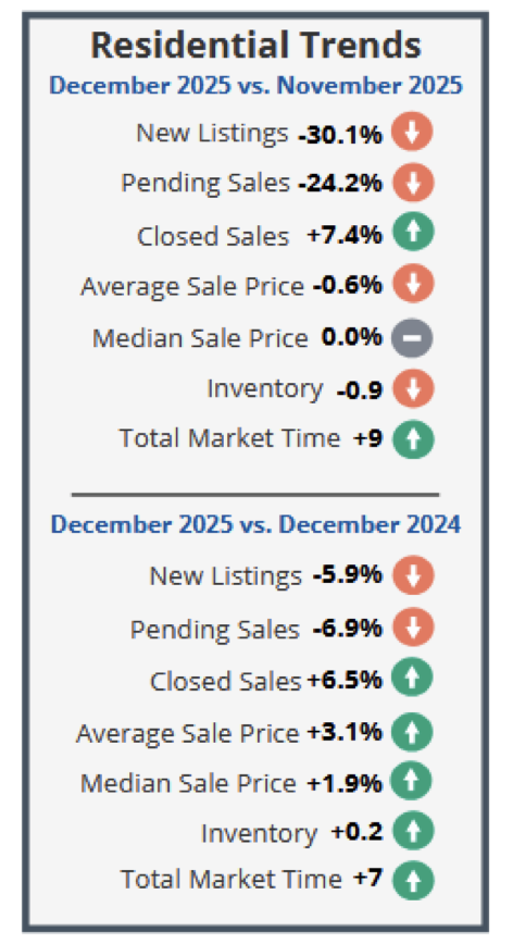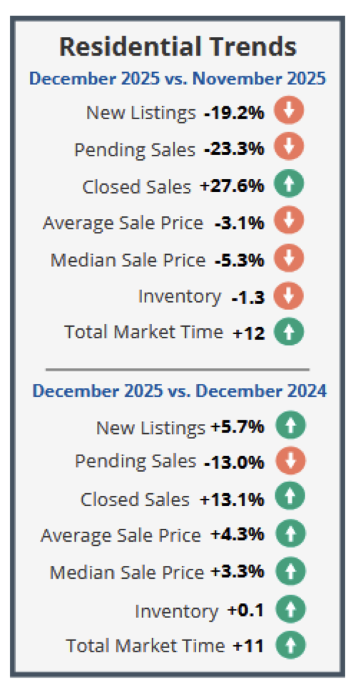 New listings (353) increased 5.7% from the 334 listed in December 2024, and decreased 19.2% from the 437 listed in November 2025. Pending sales (382) decreased 13.0% from the 439 offers accepted in December 2024, and decreased 23.3% from the 498 offers accepted in November 2025. Closed sales (518) increased 13.1% from the 458 closings in December 2024, and increased 27.6% from the 406 closings in November 2025.