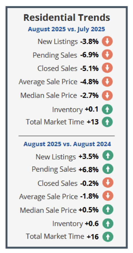Comparing the first eight months of 2025 to the same period in 2024, new listings (6,337) increased 3.3%, pending sales (4,480) decreased 0.3%, and closed sales (4,232) increased 1.4%.